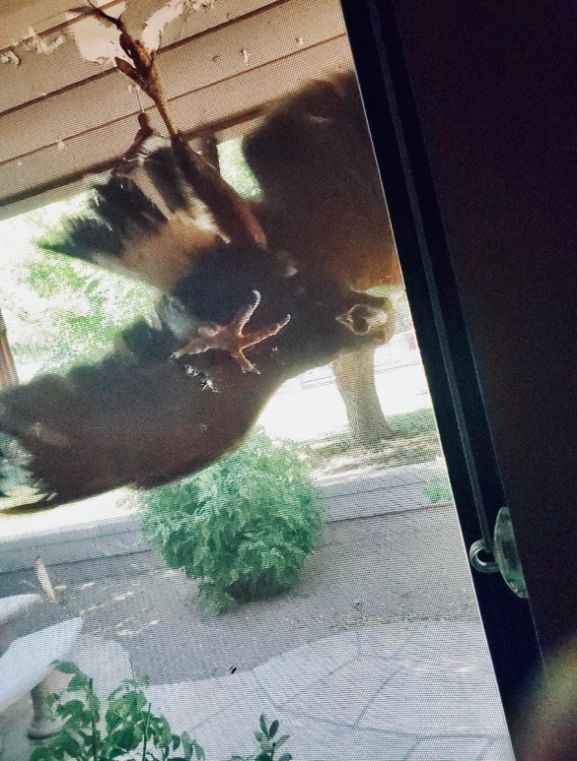 - Before and after photo of what a hawk did to a customers screen making a nest out of the fiberglass mesh
